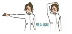 三、术后稳定期(1月以后) (一)目标:增强肌肉力量,逐步回归正常活动。 (二)禁忌:术侧手臂突然高举(如打羽毛球、游泳)。 1.绕头运动:站立位,身体不可弯曲,术肢抬起从同侧耳部逐渐摸向对侧耳后5-10分钟,每天1 ~ 2次。